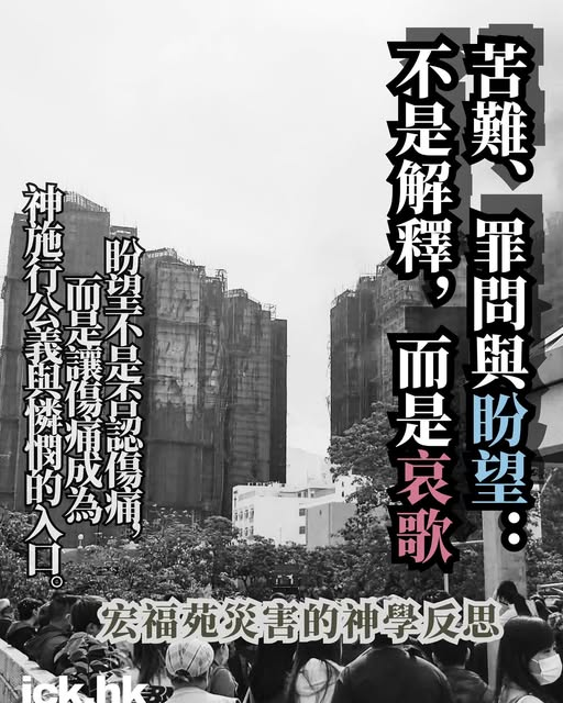 宏福苑的烈焰已熄,但餘溫仍在我們良心與記憶中燃燒。它撕裂了 #廉價的成功神學、#輕率的因果報應論、#虛浮的屬靈口號,逼我們回到聖經最赤裸、最沉重的核心:神在十字架上,早已與每一位在火場受難者同在同死;神在復活裡,已預先宣告死亡與苦難不能作王;神在今日,仍透過聖經先知與使徒的聲音呼召我們相信:〝伸冤在我,我必報應〞,所以我們不應亂估、亂講、亂傳;卻履行悔改的責任〝給孤兒伸冤,為寡婦辨屈〞⋯